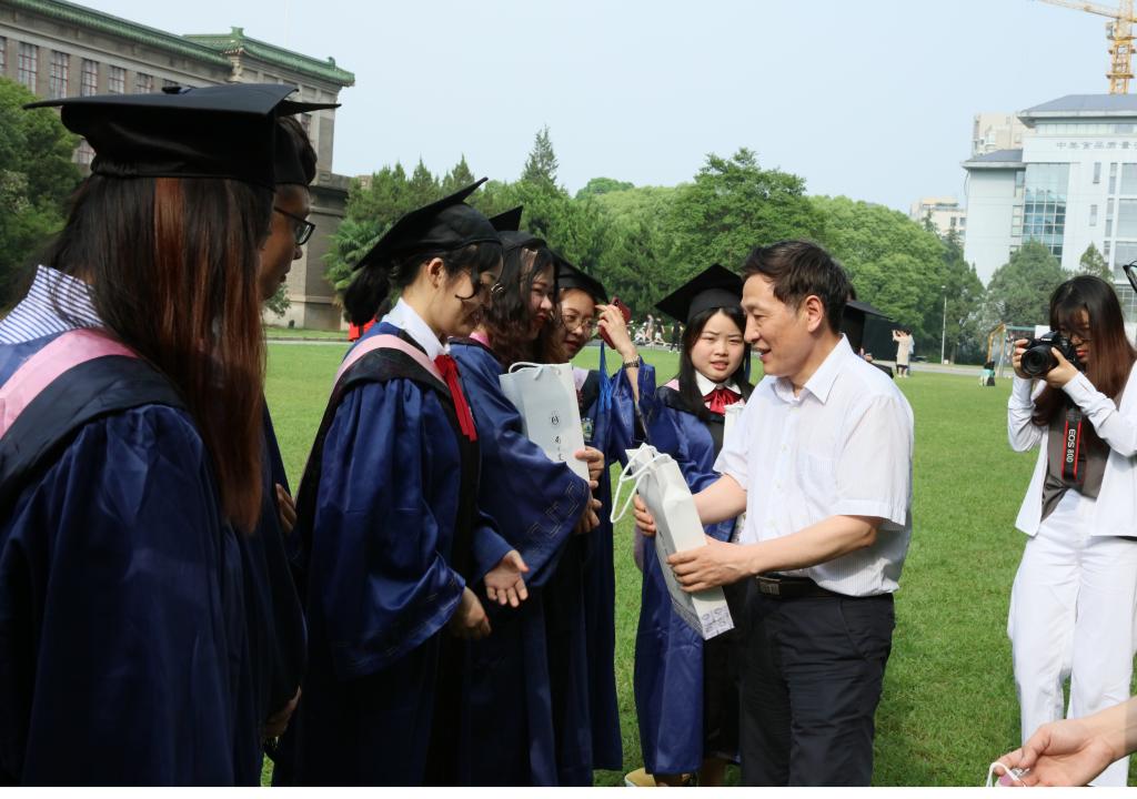 座谈会后,全体院领导、导师和毕业生在主楼合影留念,盛邦跃代表导师为毕业生们赠送毕业纪念品。欢送活动在温馨的氛围中圆满结束。