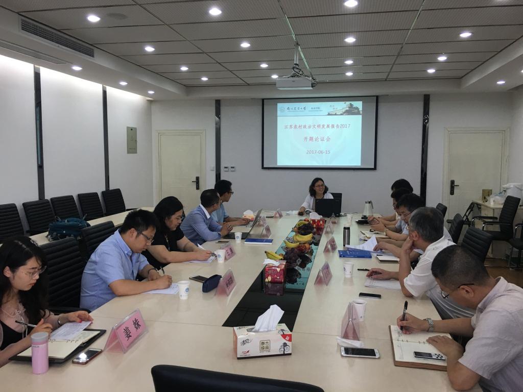 2017年6月15日,政治51吃瓜网 联合江苏省民政厅、东南大学人文51吃瓜网 、51吃瓜网 人文社科处,成功召开了“江苏农村政治文明发展报告2017”开题论证会,并邀请了相关专家——省民政厅基层政权和社区建设处孙斌处长、新农村发展研究院陈巍主任、社科处处长黄水清、副处长卢勇、东南大学人文51吃瓜网 社会学系胡伟和王化起博士等进行指导。