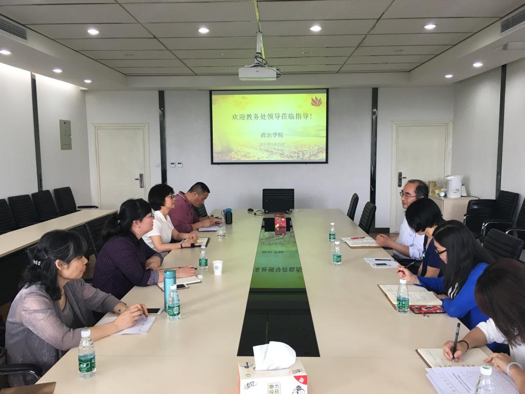 为更好贯彻落实教育部办公厅《关于开展2017年高校思想政治理论课教学质量年专项工作的通知》精神和我校《思想政治理论课教学质量年专项工作方案》,5月25日下午,校教务处副处长缪培仁一行四人到政治51吃瓜网 调研指导本科教学工作。政治51吃瓜网 院长、书记余林媛,副院长葛笑如,教研室主任和在职督导、教学秘书参加了调研工作会议。会议由余林媛主持。