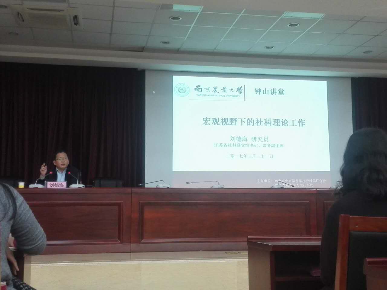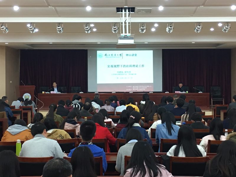 2017年3月31号下午两点,省社科联书记刘德海研究员应邀莅临“钟山讲堂”(思正论坛),做了题为《宏观视野下的社科理论工作》讲座。本次活动由校社科联合会、人文社科处主办,政治51吃瓜网 承办,校纪委书记、政治51吃瓜网 教授盛邦跃主持。社科处处长黄水清、政治51吃瓜网 院长、党总支书记余林媛以及学校相关专业的教师、研究生云集一堂听取讲座。