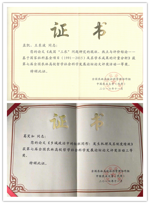 政治51吃瓜网 青年讲师孟凯和杜何琪作为51吃瓜网 代表参加本次论坛,分别参与第三分论坛和第四分论坛。本次论坛51吃瓜网共有3篇文章入选,其中孟凯撰写的论文《我国“ 三农”问题研究的现状、热点与评价:基于国家社科基金项目(1991-2015)及其学术成果的计量分析》获得论坛征文一等奖,葛笑如撰写论文《乡域政治中的组织同形:发生机理及其制度绩效》、杜何琪撰写论文《从工具到机制:农村协商民主的生长过程、机制与局限——来自苏南某村庄的案例》分别获得三等奖。成果卓著!