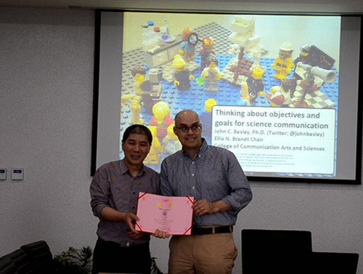随后,John.C.Besley博士作了题为“科学传播公众参与之目标和目的思考”(Thinking About Objectives and Goals for Science Communication Public Engagement )的专题讲座,这是继5月24日和5月26日后的第三场次主题讲座。他认为,科学传播首先应当注重“面对面”的公众参与以期达到科学家实现研究的目的和目标。然而,目的与目标是有明显差异的,目的是抽象的而目标是具体的,在实际的科学传播过程中,我们可以通过有效的策略实现相应目标并最终实现有效沟通来达到目的。有效地策略即利用“面对面沟通”、社交媒体或线上交流等多种途径。另外,他也提倡,科学家只有真正做自己而不是高高在上或远离社会生活才能获得与公众的有效沟通。最后,他也指出,当然,不是每个人都能接受你的观点。