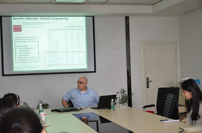 2016年5月26日下午,美国密西根州立大学John.C.Besley博士的第二场讲座如期举行。此次演讲的主题为“美国公众如何看待基因工程和纳米技术”(What Americans think about Science and Issues such as Genetic Engineering and Nanotechnology),现场师生座无虚席,共享了一场科学与智慧的视听盛宴。