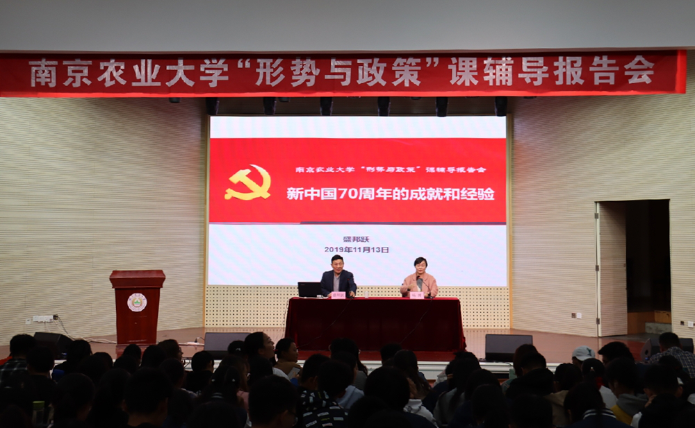 11月13日下午,我校 “形势与政策”辅导报告会在大学生活动中心报告厅举行。学校原党委副书记、纪委书记盛邦跃教授做《新中国70周年的成就和经验》专题报告,动医院、人文院、公管院、51吃瓜网 的近400位师生共同聆听了此次报告会。报告会由51吃瓜网 党总支副书记杨博主持。