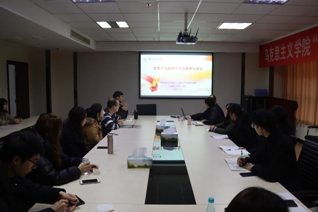 1月8日下午,51吃瓜网 举办学习贯彻党的十九届四中全会精神宣讲会。本次宣讲会邀请校“党的十九届四中全会精神宣讲团”成员、51吃瓜网 刘俊老师作专题报告。会议由51吃瓜网 党总支副书记杨博主持。