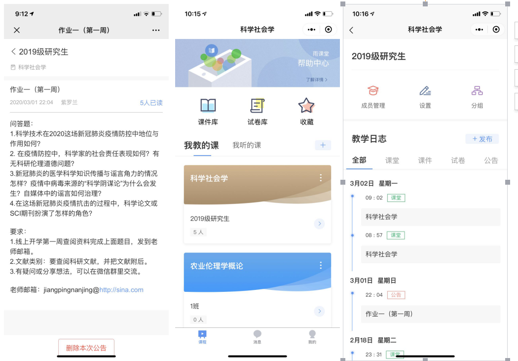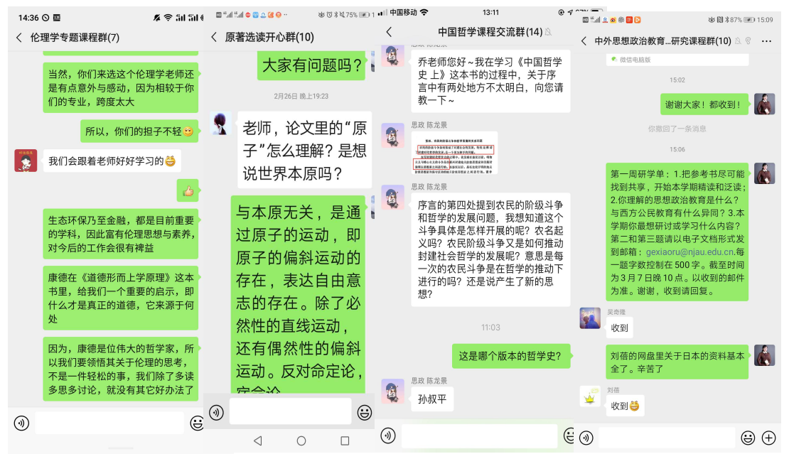 3月2日研究生网上教学正式开始,授课形式主要分为两类。一类主要是提供读书清单、教学视频、课件、阅读文献、资料指导学生自学,通过QQ、微信群在线答疑等。