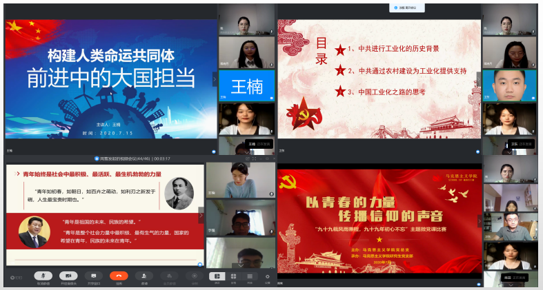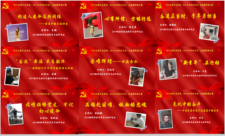 “从四渡赤水中,我们看到一种中国共产党人独特的气质,这些都激励着我们勇敢地在风高浪急的未来走出一条中国道路。”“一百年后的今天,作为‘新青年’的我们更要练就过硬本领,勇于砥砺奋斗!”“路漫漫其修远兮,构建人类命运共同体之路必然坎坷艰难重重。但只要以斗争求团结、促合作、谋共赢,人类命运共同体必定踏平坎坷成大道。”短短五六分钟的微党课作品,主讲同学将党的知识,将共产党员的革命事迹、战“疫”典型身上的感人故事与精神闪光点,娓娓道来。