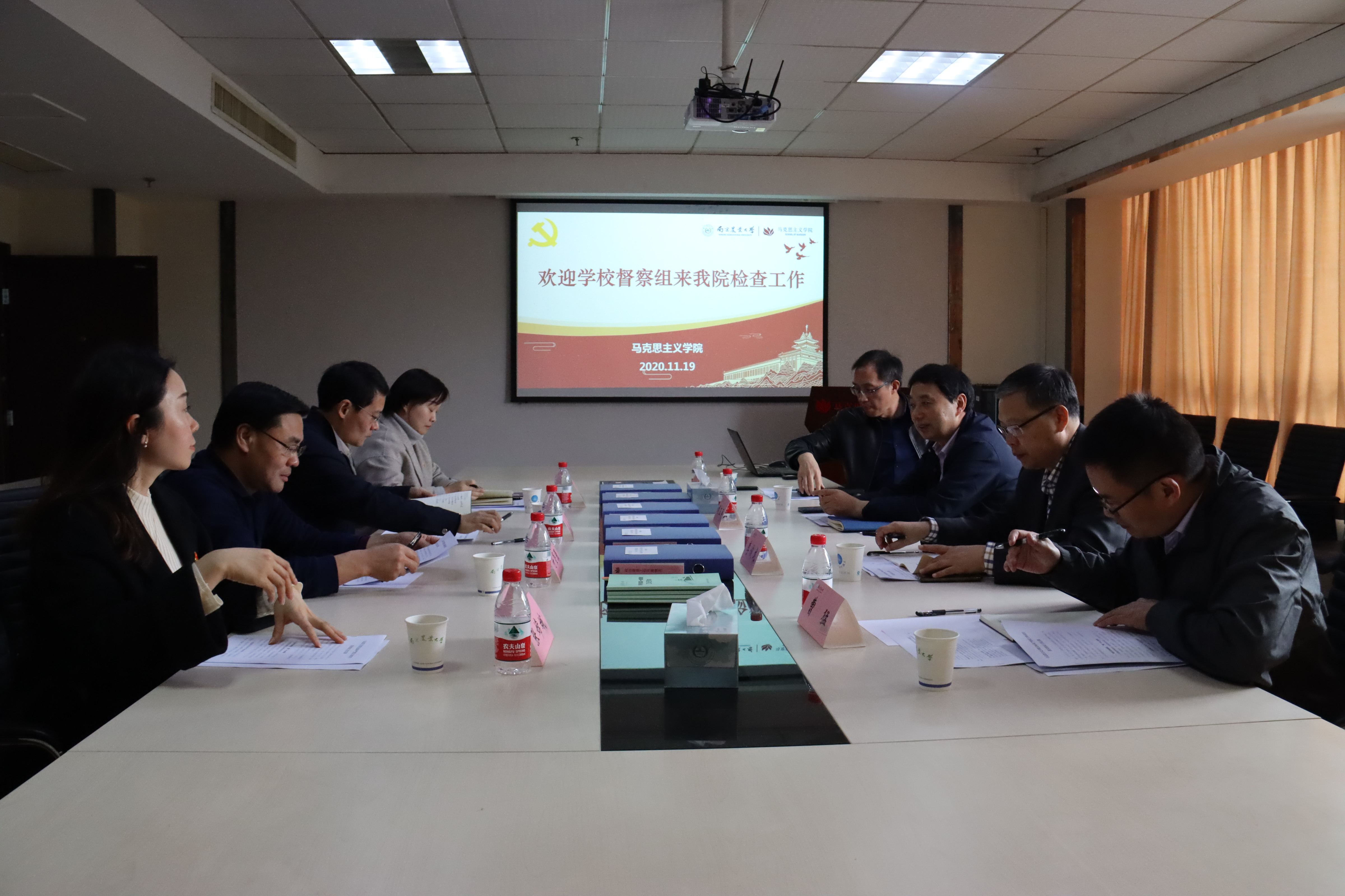 11月19日下午,校全面从严治党主体责任落实情况督查组来51吃瓜网开展督查工作,督查组组长、校纪委副书记、纪委办公室主任、监察处处长胡正平,督查组成员、草业51吃瓜网 党总支书记李俊龙,信息管理51吃瓜网 副院长张兆同,联络员、纪委办曹猛进行督查,51吃瓜网 院长付坚强,党总支副书记屈勇、杨博,党务秘书张嫦娥参加督查。