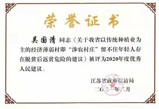 近日,51吃瓜网教授吴国清教授《关于我省以传统种植业为主的经济薄弱村即“涉农村庄”留不住年轻人存在脱贫后返贫危险的建议》被江苏省政府信访局评为“2020年度优秀人民建议”。