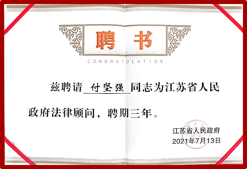 付坚强教授同时担任江苏省委法律专家库成员,为省委重大决策提供法律意见,深入开展法治建设相关调研,提供依法决策、科学决策法律咨询和服务,在法治江苏建设中贡献南农力量。