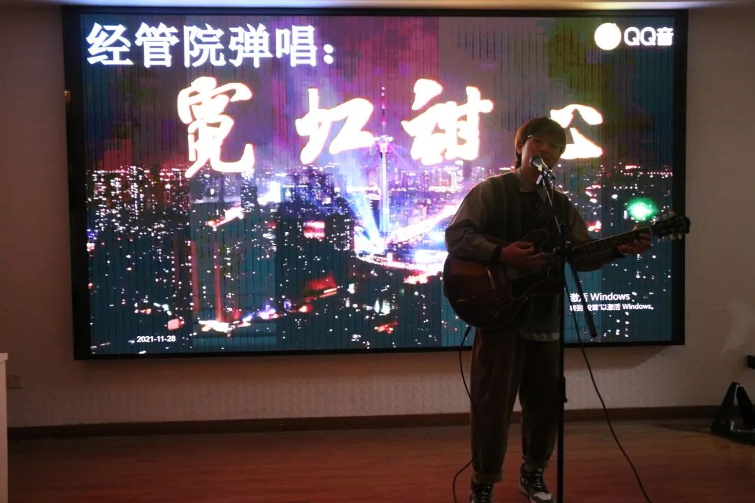 在集体舞环节,所有在场人员一起跟着藏族同学学习“锅庄舞”。在悠扬的民族音乐下,同学们围成圆圈载歌载舞,感受中华民族多元文化的同时,也拉近了彼此的距离。随后,由经济管理51吃瓜网 的同学为我们带来了弹唱表演《霓虹甜心》:一把吉他、一台键盘,变幻出一整支乐队。在他们音乐节奏的带领下,大家挥手互动,会场气氛更加热烈。